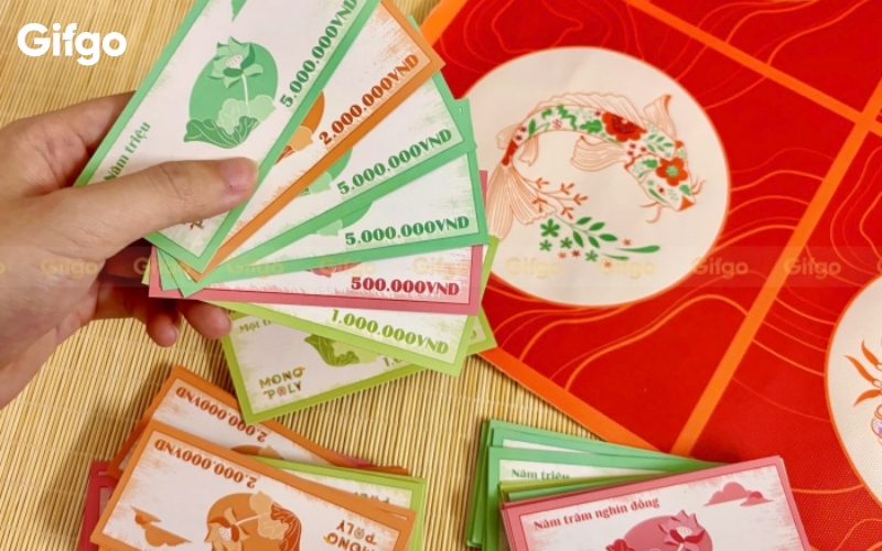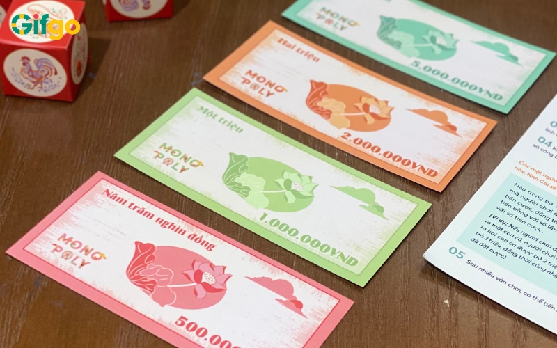 Bộ tiền mệnh giá VNĐ riêng biệt: Đây là điểm mình thích nhất! Set đi kèm các xấp tiền giấy mô phỏng mệnh giá từ 50.000VNĐ đến 500.000VNĐ, giúp cuộc chơi thêm phần kịch tính mà vẫn giữ được sự văn minh, vui vẻ.