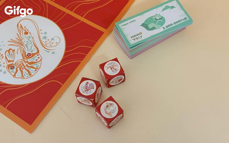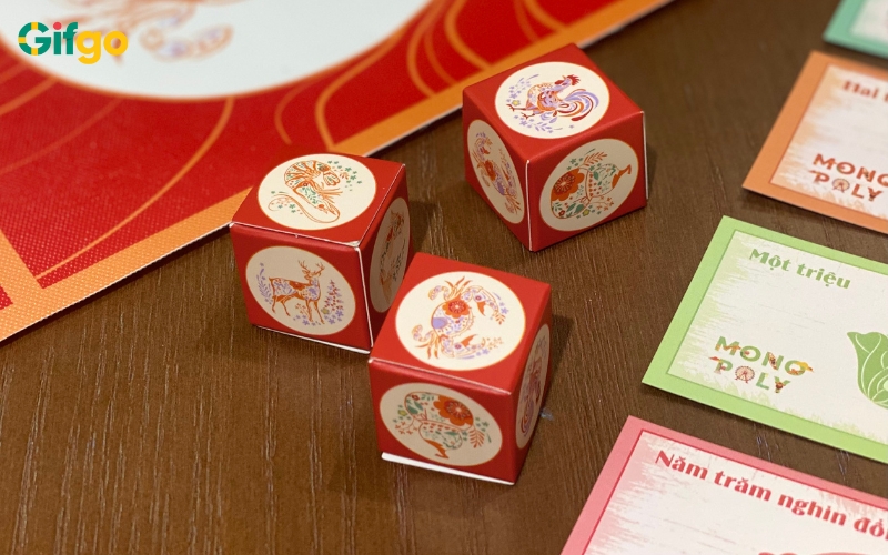 3 viên xúc xắc độc bản: Những quân xúc xắc được chế tác vuông vức, cầm chắc tay với hình in linh vật đồng bộ hoàn hảo với bàn chơi, tạo nên sự chuyên nghiệp trong từng lượt gieo.