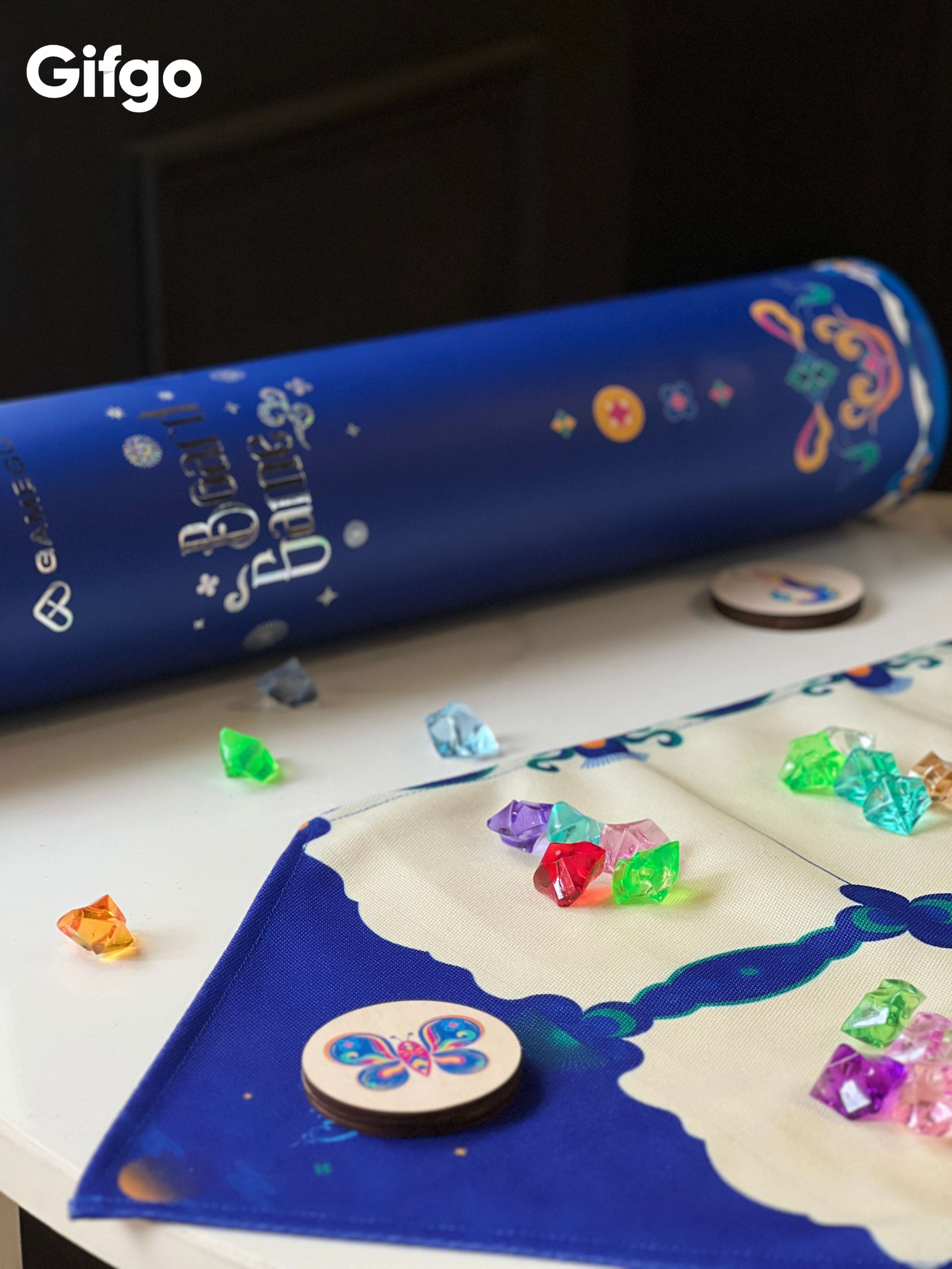 Bàn cờ được thiết kế trên chất liệu mềm mại, có thể cuộn lại dễ dàng nhưng vẫn phẳng phiu khi trải ra. Những họa tiết hoa văn cổ truyền được phối màu xanh dương sâu thẳm cùng sắc vàng hoàng gia, tạo nên một tổng thể vừa hoài cổ vừa thượng lưu. Đặc biệt, các ô Quan được minh họa bằng những hình ảnh sinh động như tôm, cá, bướm... tạo cảm giác gần gũi và đầy sức sống.