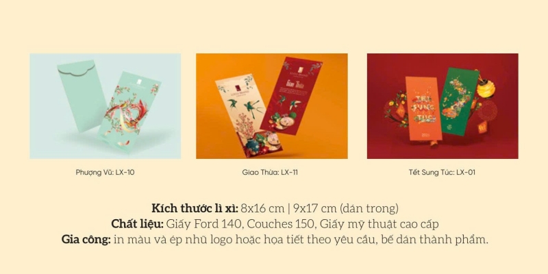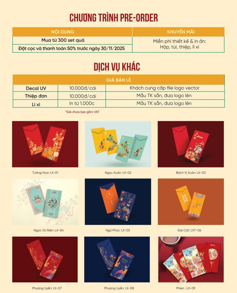 Dịch vụ kèm theo: Thiết kế thiệp, lì xì và in logo (có phí hoặc miễn phí).