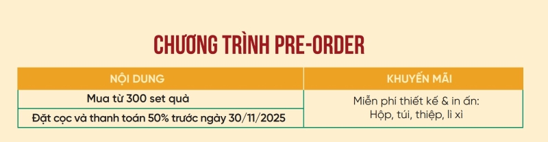 Quyền lợi khi pre-order: Khách hàng được miễn phí thiết kế và in ấn: hộp, túi, thiệp, lì xì, giúp tối ưu chi phí và sở hữu bộ quà tặng đồng bộ, chuyên nghiệp.