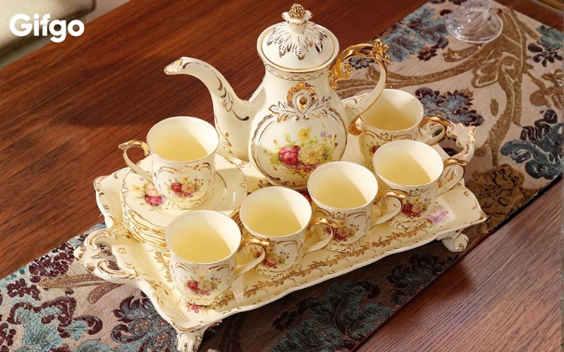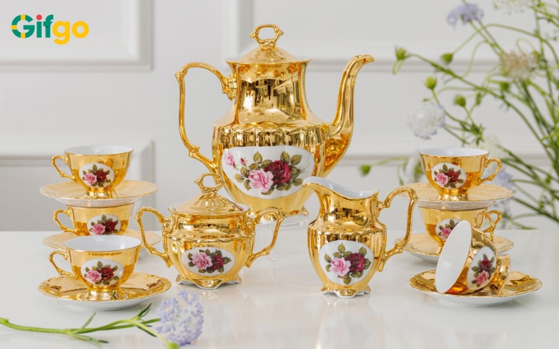 Bộ ấm chén gốm sứ cao cấp là biểu tượng của sự ổn định và sum vầy. Gốm sứ vốn thuộc hành Thổ, khi qua lửa nung rèn luyện sẽ trở nên cứng cáp và tinh xảo, giống như bản tính kiên định của gia chủ mệnh Thổ. Một bộ ấm chén mang nét đẹp thanh lịch, nhã nhặn tôn vinh nét văn hóa thưởng trà truyền thống, mang ý nghĩa về sự gắn kết, sum vầy.