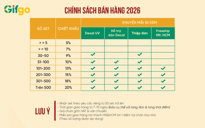 Để giúp doanh nghiệp tối ưu chi phí và hưởng trọn các ưu đãi theo số lượng, Gifgo xây dựng Chính sách bán hàng 2026 với mức chiết khấu hấp dẫn, quyền lợi rõ ràng hơn và nhiều hạng mục tặng kèm giá trị.