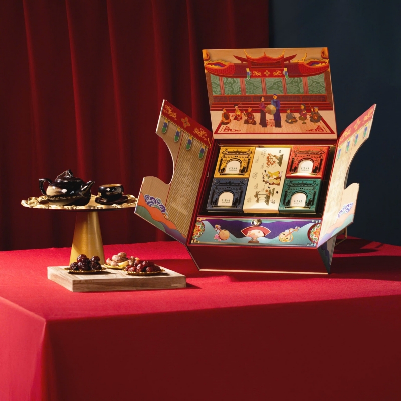 Lấy cảm hứng từ biểu tượng “Ngũ Phúc lâm môn” – năm điều lành Phúc, Lộc, Thọ, Khang, Ninh, mẫu Vượng Cát 02 được xây dựng như một lời chúc trọn vẹn cho năm mới an yên và thịnh vượng. Thiết kế hộp cứng tông xanh trang nhã, họa tiết truyền thống, tạo cảm giác hài hòa giữa giá trị văn hóa và tinh thần hiện đại. Điểm khác biệt của set quà nằm ở sự kết hợp thêm boardgame, giúp tăng cường trải nghiệm gắn kết, biến món quà Tết không rượu thành một hoạt động sẻ chia trọn vẹn trong những ngày sum vầy.