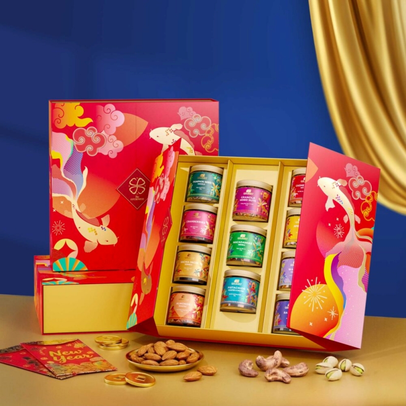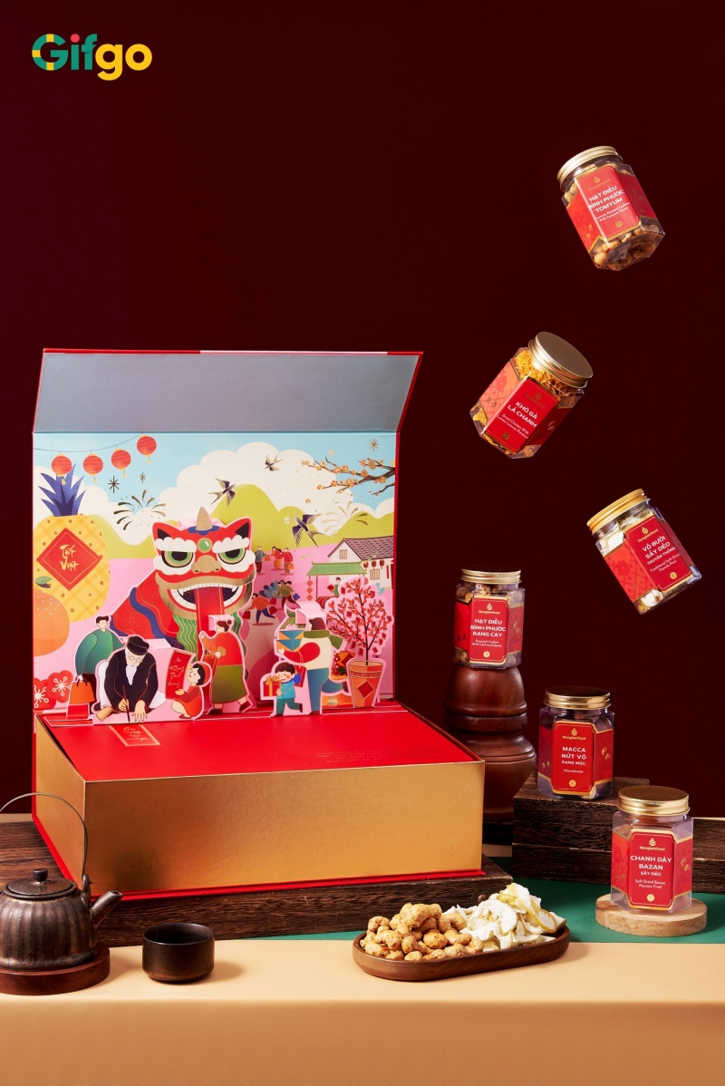 Mở ra như một không gian Tết thu nhỏ, hộp quà tết Nông Sản 02 gây ấn tượng với những lớp họa tiết mang đậm không khí xuân truyền thống. Hình ảnh lân múa rồng rộn ràng tượng trưng cho khí thế khởi sắc đầu năm, kết hợp cùng câu đối đỏ gửi gắm lời chúc cát tường, bình an. Tất cả hòa quyện trên nền hộp cứng tông đỏ ấm áp, tạo cảm giác trang trọng khi biếu tặng. Bên trong hộp là sự sắp xếp gọn gàng của các loại hạt dinh dưỡng, hoa quả sấy và trà, hướng đến giá trị sử dụng thực tế và phù hợp với xu hướng quà Tết không rượu.