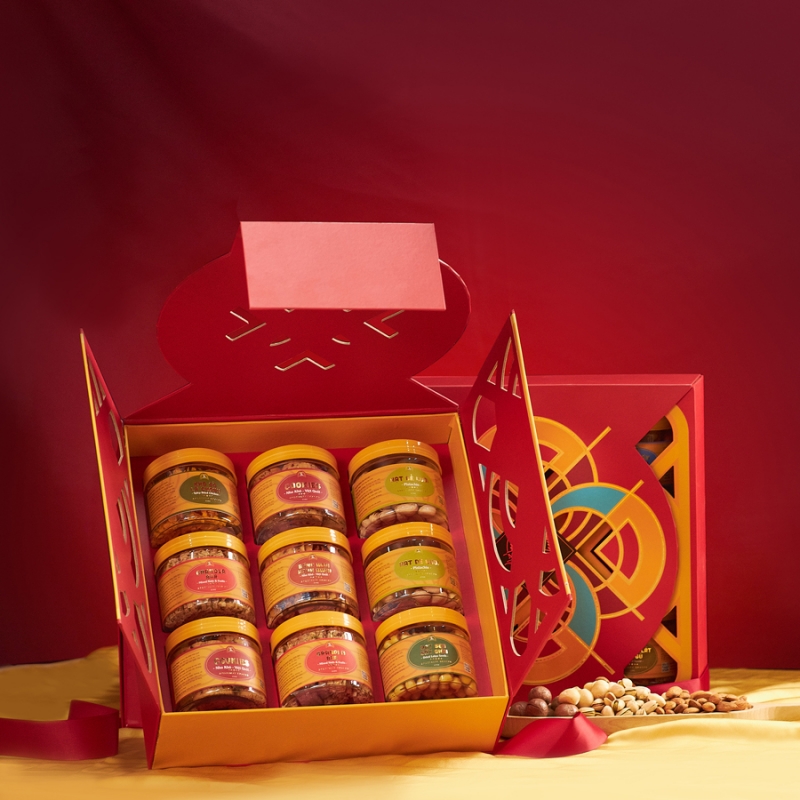 Nông Sản 03 mang đến cảm giác Tết rộn ràng theo cách nhẹ nhàng và gần gũi. Trên nền hộp cứng tông đỏ ấm, các lớp họa tiết mở nổi tái hiện không khí xuân với hình ảnh lân múa rồng, câu đối chúc phúc và sắc đào mai đan xen, gợi nên sự sum vầy và khởi đầu thuận lợi cho năm mới. Bên trong hộp là sự sắp xếp gọn gàng của các loại hạt rang nhiều hương vị, trái cây sấy và trà, tạo nên một set quà Tết không rượu giàu trải nghiệm cho khách hàng.