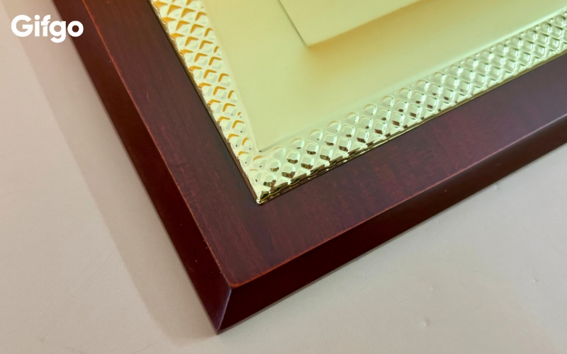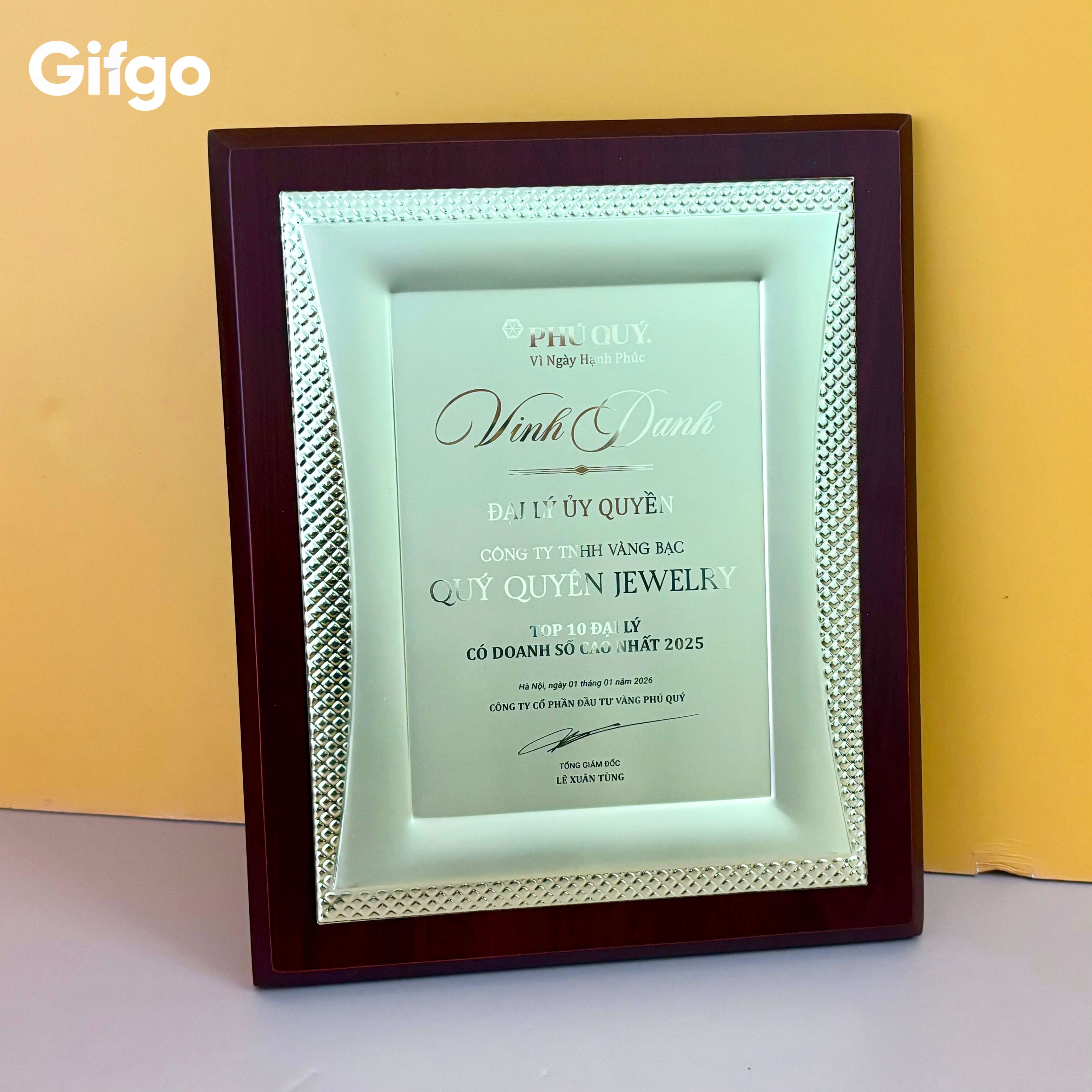 Tấm bằng vinh danh được thiết kế trên nền mạ vàng kết hợp với khung gỗ đỏ nâu sang trọng, tạo cảm giác vững chãi và ấm áp. Điểm nhấn nổi bật chính là tấm kim loại màu vàng đồng óng ả được chế tác tinh xảo với các đường viền dập nổi cầu kỳ, tạo hiệu ứng thị giác vô cùng thu hút dưới ánh đèn sân khấu. Màu vàng đồng đại diện cho kim loại quý - vốn là linh hồn của Phú Quý, tượng trưng cho vinh quang và những thành tích "vàng" của các đại lý ủy quyền xuất sắc trong năm 2025.