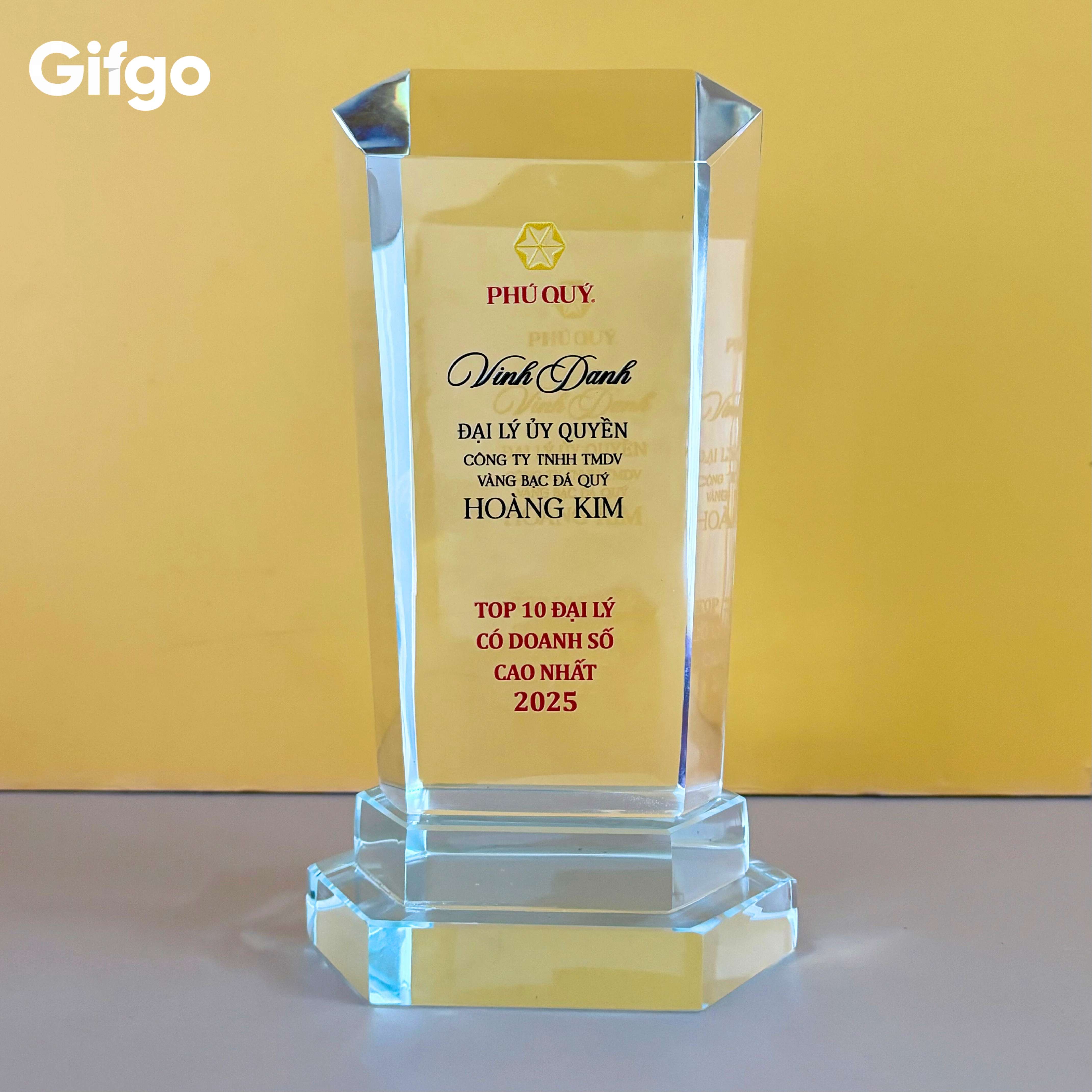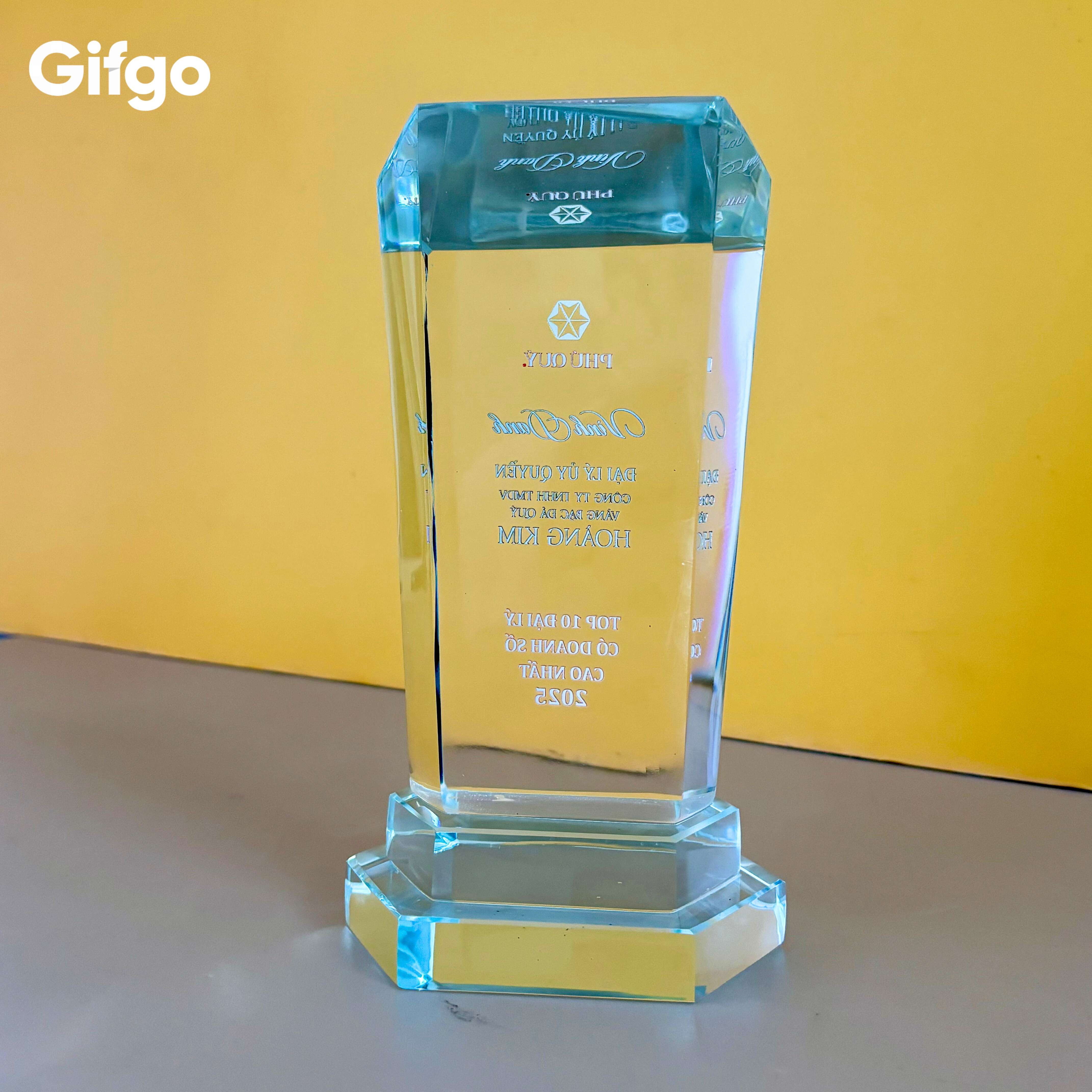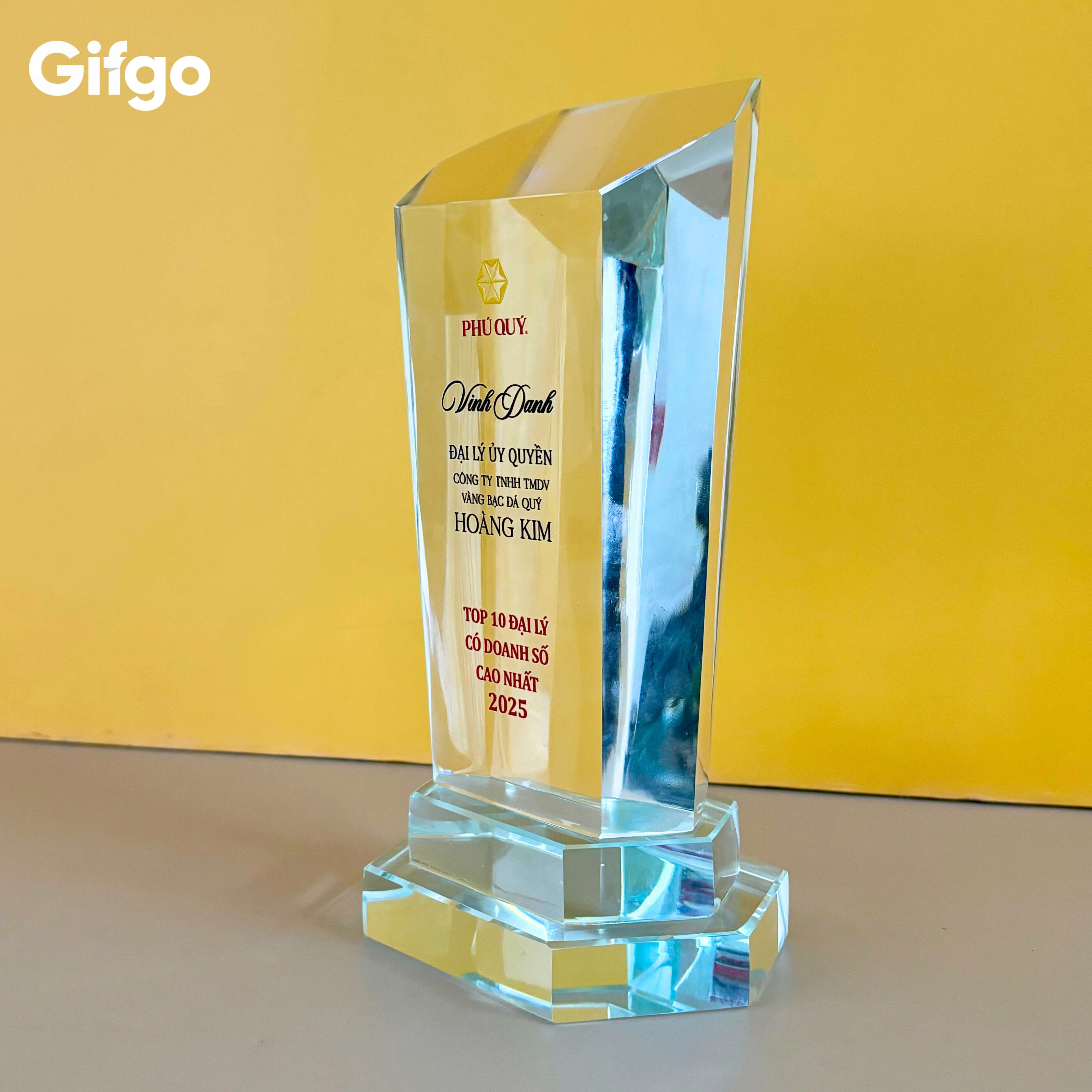 Song song với bằng vinh danh, Gifgo triển khai thiết kế cúp pha lê như một biểu tượng cao nhất dành cho những đại lý, doanh nghiệp đạt thành tích nổi bật. Cúp được tạo hình khối đứng vững chắc, các mặt cắt sắc nét và trong suốt, giúp phản chiếu ánh sáng tự nhiên, tạo hiệu ứng sang trọng khi đặt tại các không gian trưng bày trang trọng.