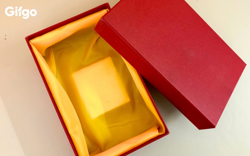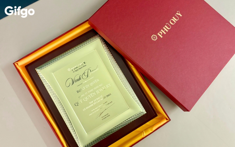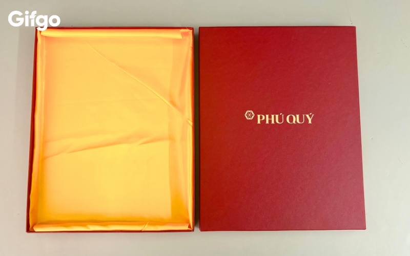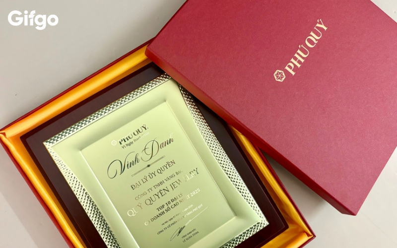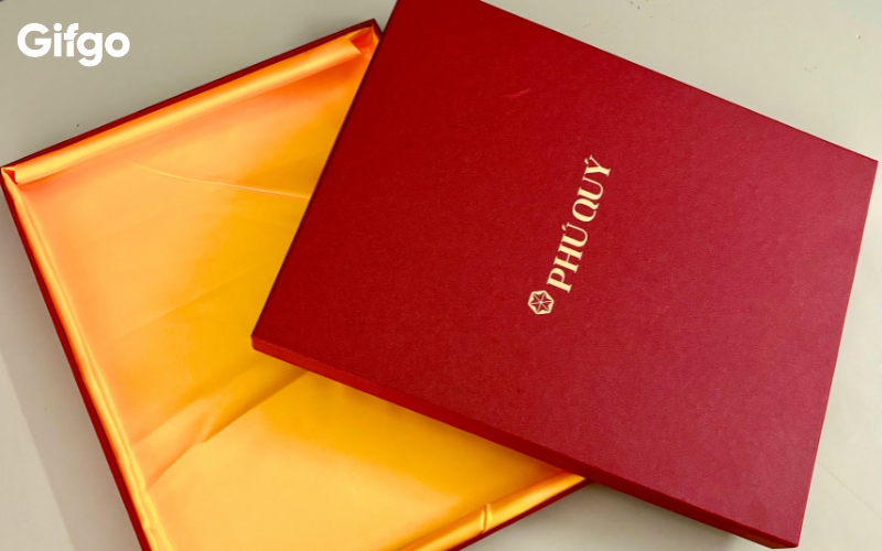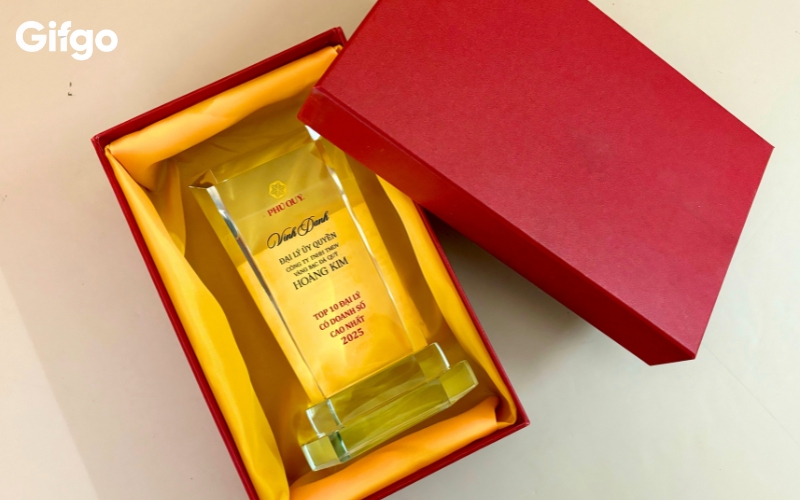Khi mở nắp hộp, lớp vải lụa màu vàng óng ả bao phủ bên trong không chỉ giữ cho sản phẩm ổn định mà còn tạo nên sự tương phản màu sắc cực kỳ bắt mắt, tôn vinh vẻ đẹp của bằng vinh danh và cúp pha lê. Sự kết hợp giữa "vỏ đỏ, lót vàng" hai gam màu kinh điển của sự thịnh vượng chính là cách Gifgo giúp Phú Quý gửi gắm trọn vẹn sự trân trọng đến từng đối tác, biến lễ tổng kết năm 2025 thành một kỷ niệm khó quên.