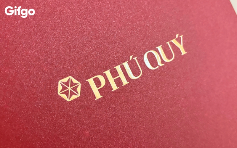 Điểm cuối cùng hoàn thiện bộ giải pháp chính là chiếc hộp đựng quà tặng cao cấp với sắc đỏ biểu trưng cho sự may mắn và thành công rực rỡ. Ngay mặt ngoài của hộp, logo Phú Quý được in ép kim nổi bật và trang trọng, tạo ấn tượng mạnh mẽ về sự chuyên nghiệp của thương hiệu ngay từ giây phút đầu tiên tiếp xúc. Chất liệu giấy vân mỹ thuật cứng cáp giúp bảo vệ tuyệt đối món quà bên trong đồng thời mang lại cảm giác chỉn chu, tinh tế.