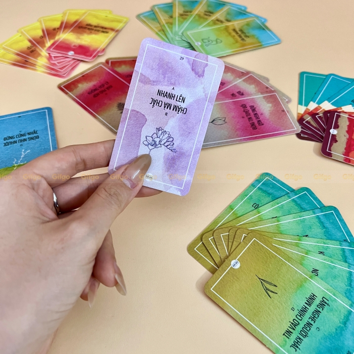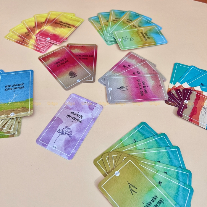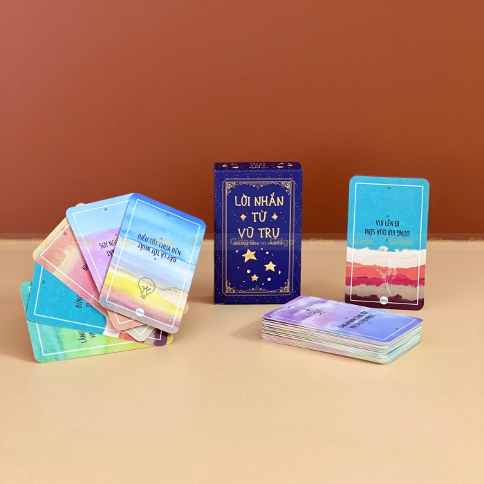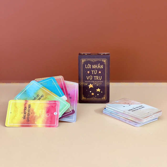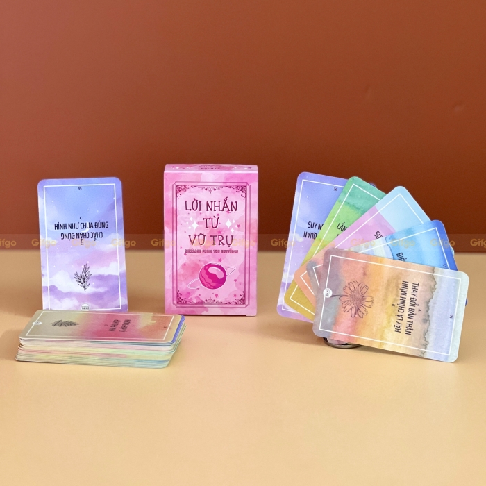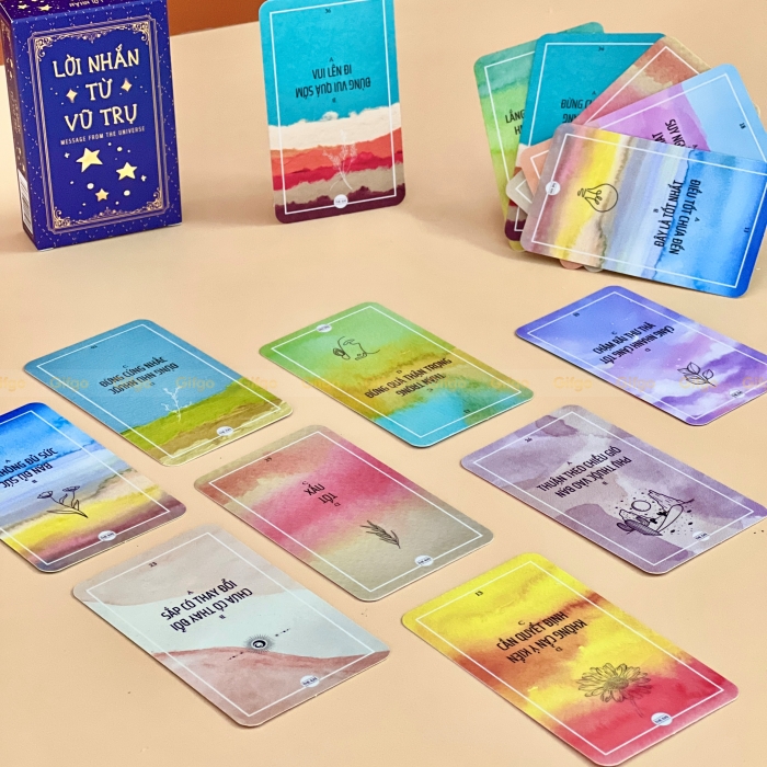 Mang tên "Lời nhắn từ vũ trụ", Bộ bài tiên tri tarot với 3 tone màu nâu, hồng và xanh dương ấn tượng. Sản phẩm bao gồm 36 lá bài được thiết kế tinh tế với phong cách hiện đại, sử dụng các gam màu tươi sáng và hình ảnh trừu tượng. Mỗi lá bài chứa một thông điệp sâu sắc, mang tính gợi mở, giúp người dùng tìm kiếm cảm hứng, định hướng và kết nối với tâm hồn mình.