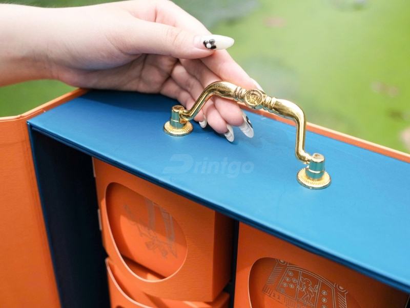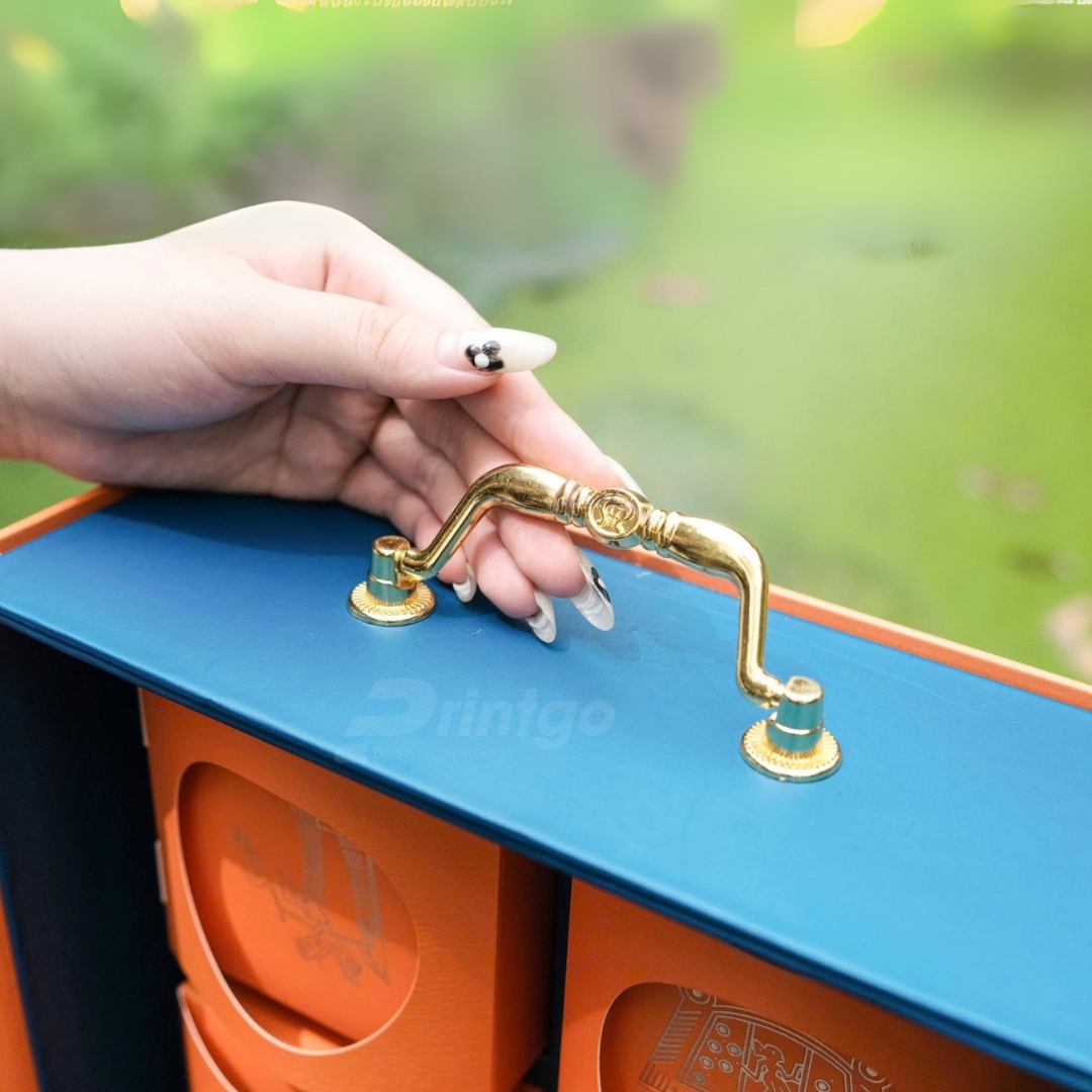 Hơn nữa, toàn bộ bề mặt hộp được ép kim lấp lánh, tạo nên hiệu ứng ánh sáng mê hoặc, khiến sản phẩm nổi bật giữa muôn vàn lựa chọn. Kết hợp cùng quai xách mạ đồng óng ánh và khuy cài kim loại tinh tế, Bộ Hồng Bàng không chỉ toát lên vẻ xa xỉ mà còn mang tính thực tiễn cao, biến mỗi món quà thành biểu tượng của sự tinh tế và lịch lãm trong mùa trung thu đoàn viên.