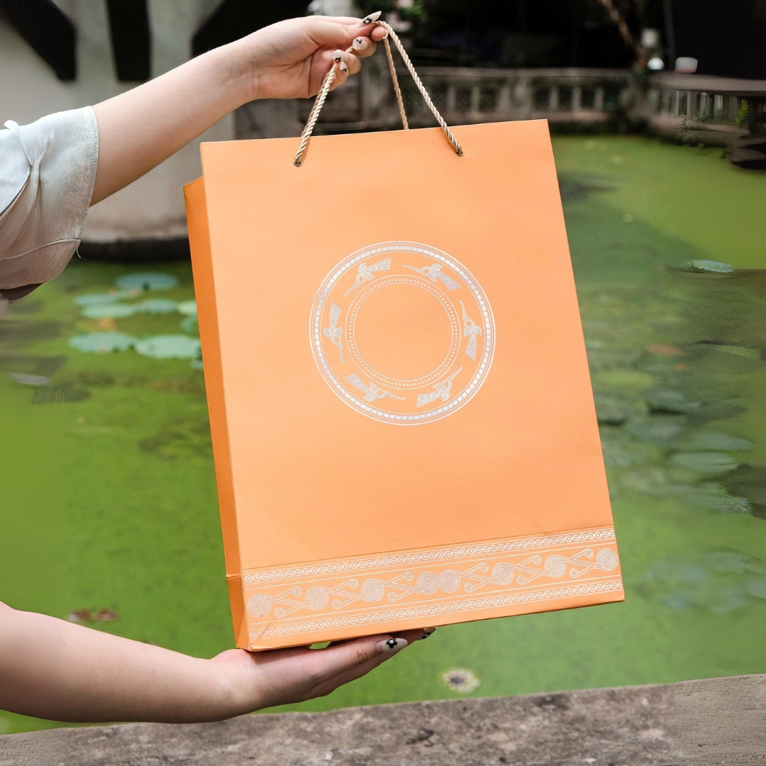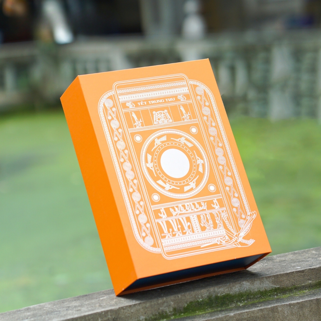 Lấy cảm hứng từ trống đồng Đông Sơn - báu vật bất diệt của nền văn minh Lạc Việt, thiết kế hộp Hồng Bàng khéo léo khắc họa hình ảnh chim hạc bay lượn, vòng tròn mặt trời rực rỡ và những lễ hội cổ xưa, tất cả được sắp xếp trong bố cục hài hòa, hiện đại. Tông màu cam đất ấm áp gợi nhớ mùa thu hoạch bội thu, tạo nên sức hút thị giác mạnh mẽ, đồng thời làm nền tảng hoàn hảo để tôn vinh những nét đẹp dân tộc. Mỗi đường nét không chỉ là hình ảnh, mà còn là lời nhắc nhở về giá trị văn hóa sâu sắc, khiến hộp bánh trở thành kiệt tác nghệ thuật sống động.
