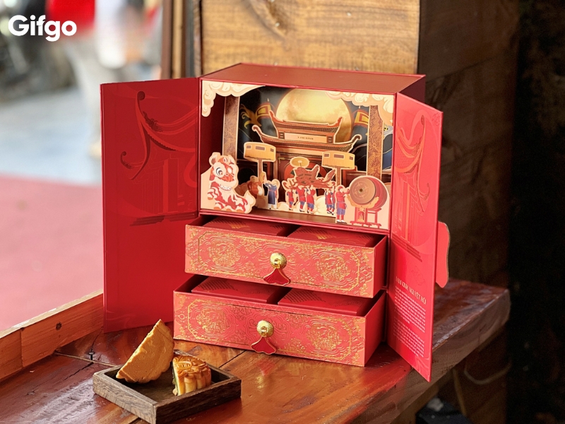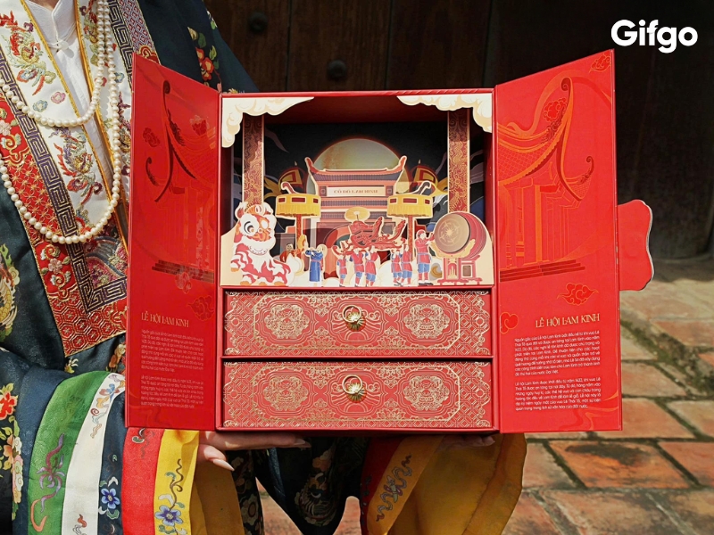 Hộp bánh Lam Kinh được thiết kế với quy cách cánh bướm tích hợp nam châm, đảm bảo sự chắc chắn và mang lại cảm giác sang trọng khi sử dụng. Phần nắp hộp là bức tranh 3D sống động, tái hiện khung cảnh lễ hội với độ chân thực đáng kinh ngạc. Bên dưới, ngăn kéo hai tầng đựng 4 bánh được gia công tỉ mỉ với khuy kéo mạ đồng cao cấp, vừa tiện lợi vừa tăng thêm vẻ đẹp tinh xảo.