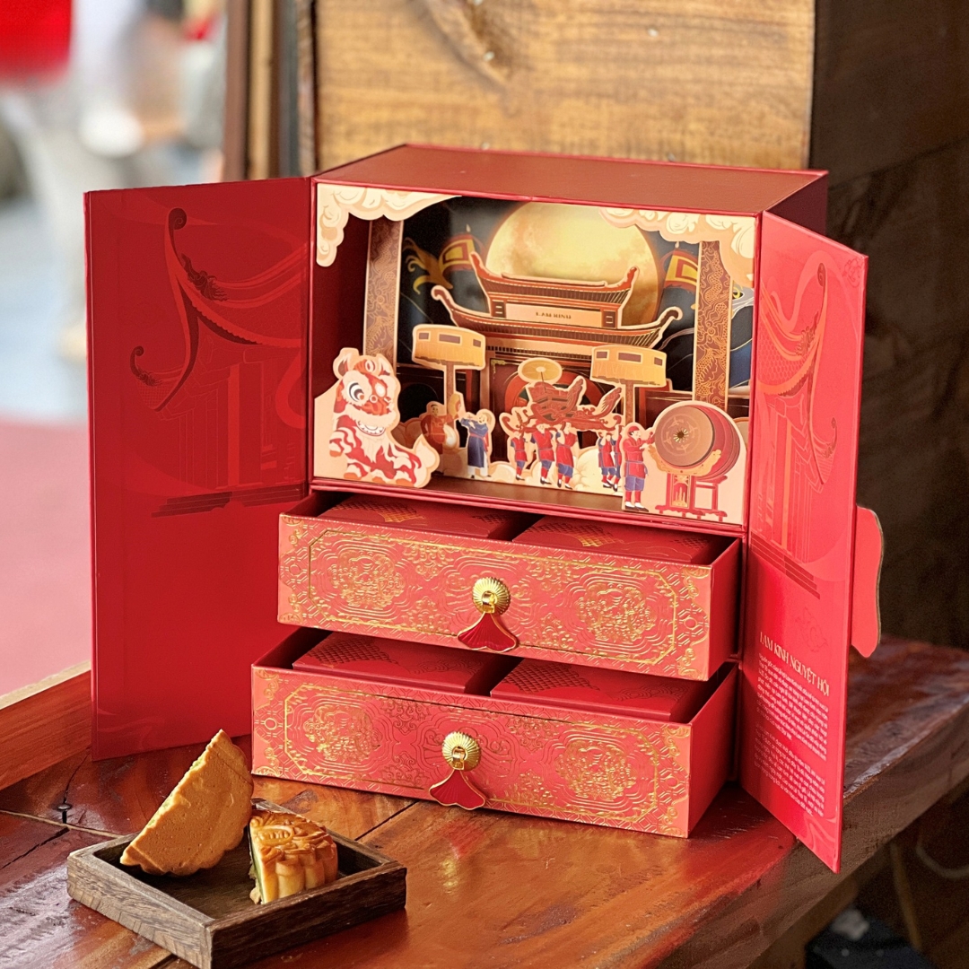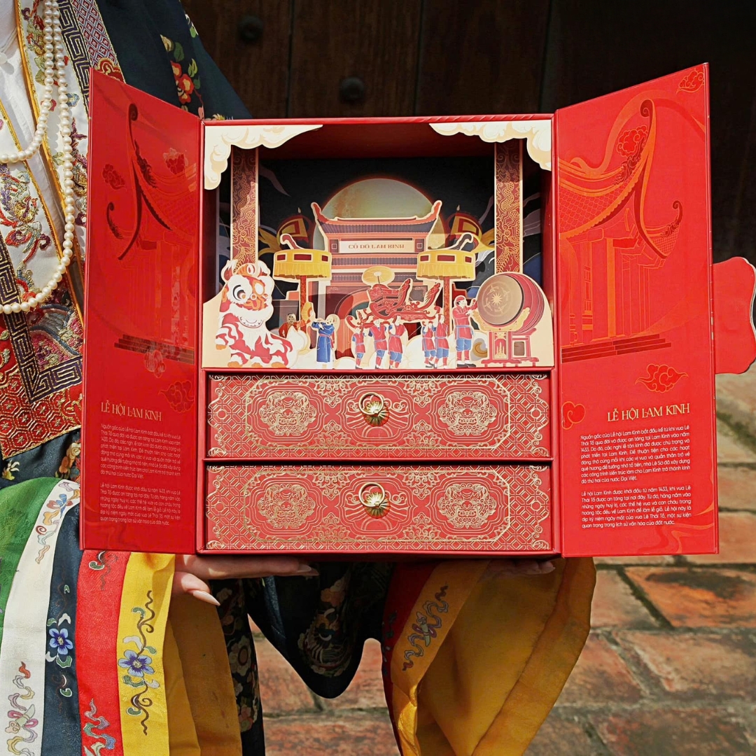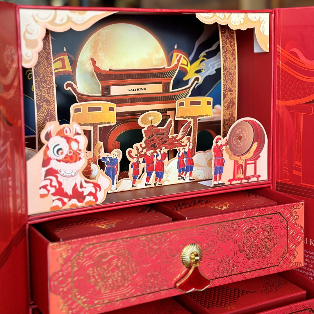 Lấy cảm hứng từ lễ hội Lam Kinh lịch sử, hộp bánh trung thu Lam Kinh Nguyệt Hội là một tác phẩm nghệ thuật sống động. Được chế tác bằng kỹ thuật in 3D tiên tiến, hộp bánh tái hiện cảnh đêm rằm rực rỡ trước cổng thành, với sắc đỏ may mắn chủ đạo, gợi lên không khí đoàn viên ấm áp. Tiếng trống rền vang, đoàn rước kiệu, và những trò chơi dân gian như Trò Chiêng, Xuân Phả được khắc họa tinh xảo, mang đến cảm giác như đang hòa mình vào không gian văn hóa truyền thống. Mỗi chi tiết ép kim lấp lánh trên nền đỏ thắm không chỉ làm nổi bật vẻ đẹp thẩm mỹ mà còn khơi dậy lòng tự hào dân tộc, nhắc nhở về công lao của cha ông.
