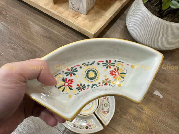 Khay mứt gốm sứ 01 sang trọng với chất liệu sứ trắng cao cấp, cùng họa tiết vẽ tay tinh xảo. Được thiết kế dạng hoa lá cách điệu, kết hợp giữa các tông màu đỏ, vàng và xanh lá, họa tiết không chỉ tạo nên sự nổi bật mà còn mang ý nghĩa may mắn, thịnh vượng trong văn hóa ngày Tết. Khay gồm nhiều ngăn hình quạt được sắp xếp xung quanh một bát tròn ở trung tâm, giúp phân chia mứt hoặc các loại hạt một cách gọn gàng, phù hợp với không gian bàn tiệc ngày Tết.
