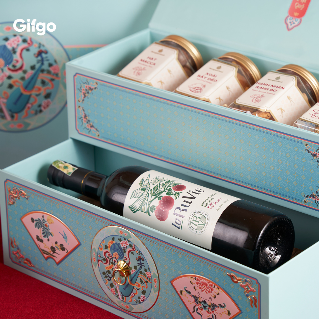 Bên trong là các hũ quà nông sản và đặc sản được tuyển chọn kỹ lưỡng, kết hợp cùng rượu vang thượng hạng, mang đến hương vị phong phú và trọn vẹn cho dịp Tết. Đây là lựa chọn lý tưởng dành cho doanh nghiệp muốn gửi tặng khách hàng, đối tác và những người thân quý.