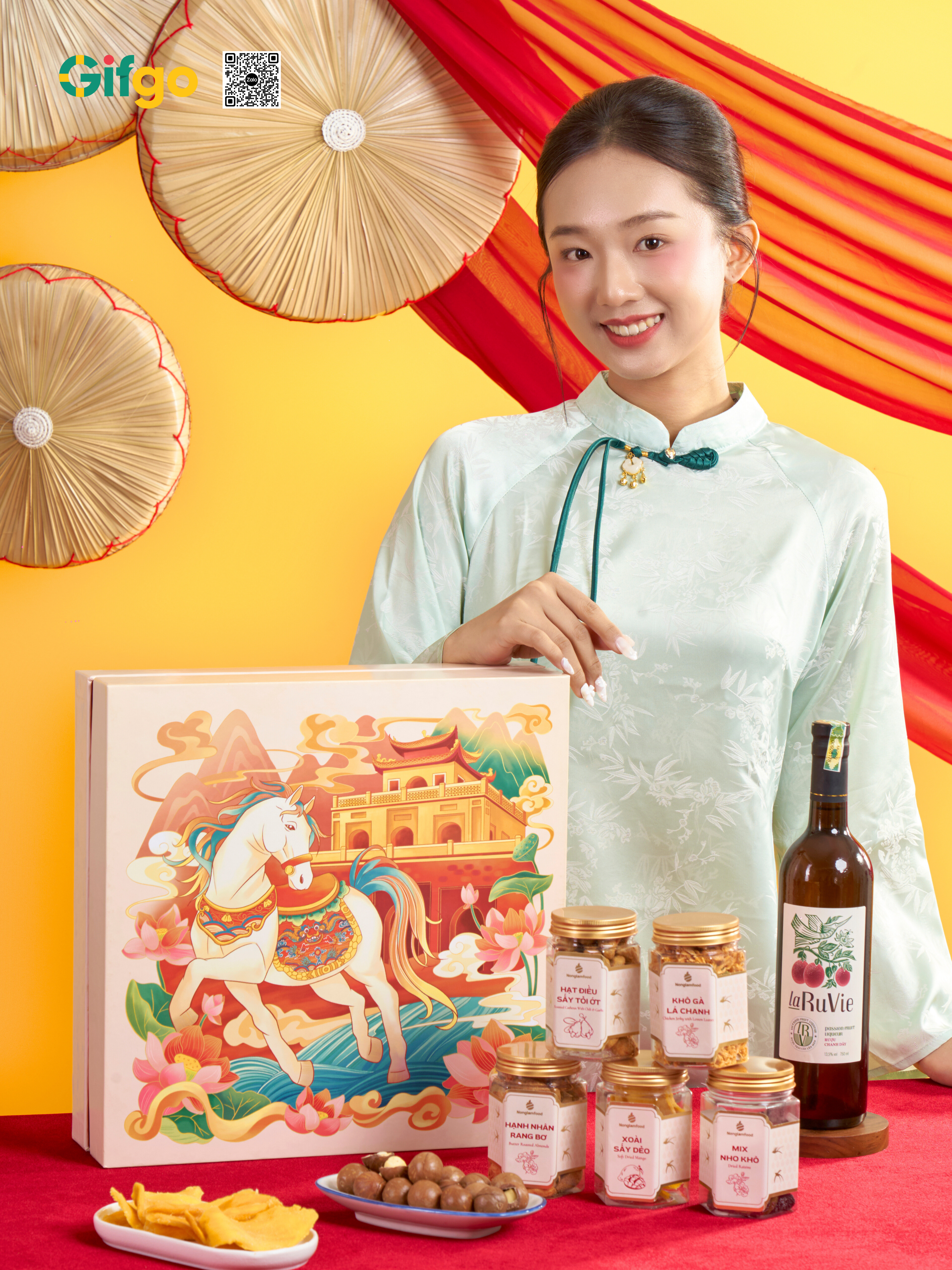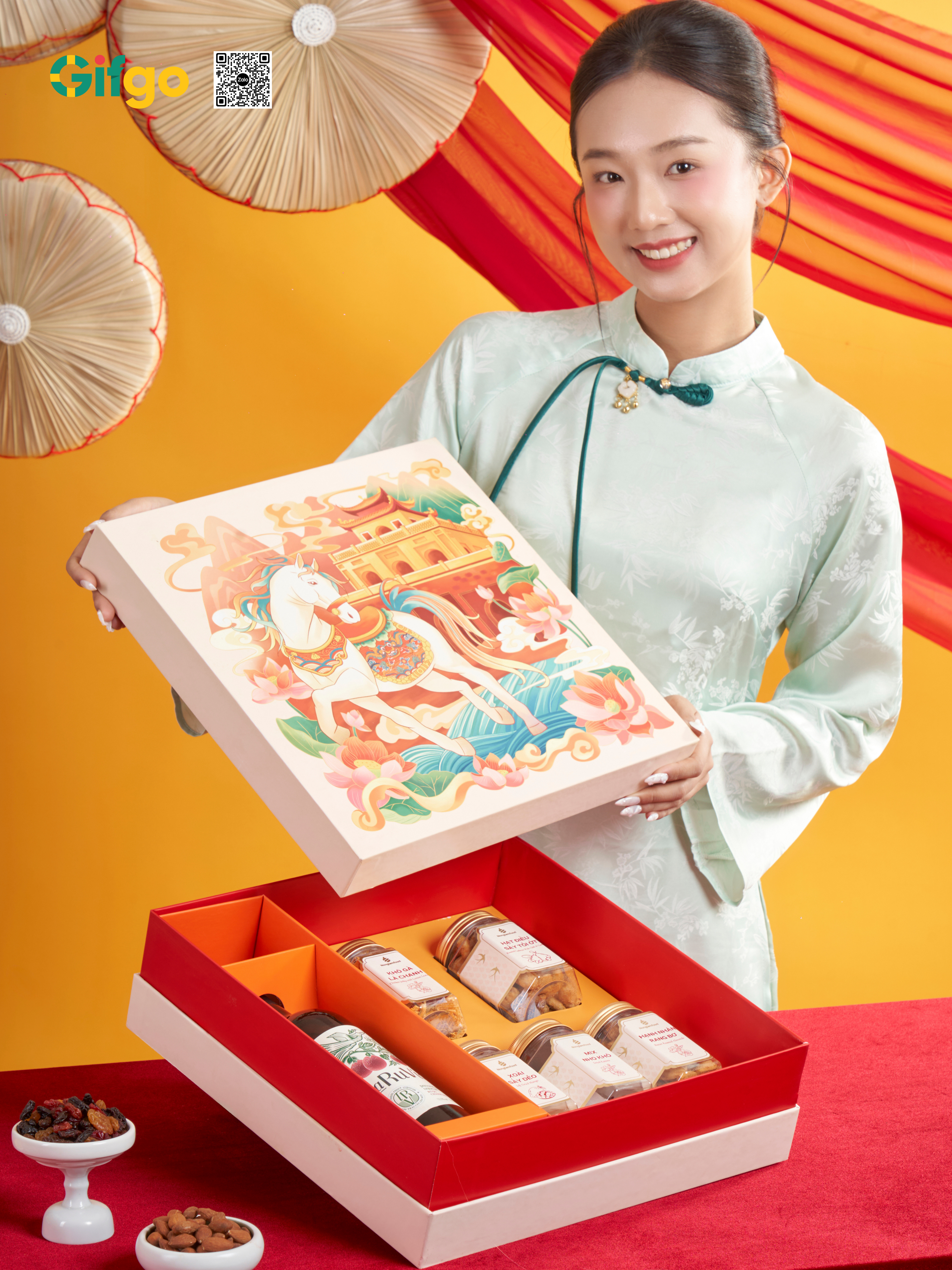 Bên trong là những món quà được tuyển chọn từ nông sản cao cấp, mang hương vị phong phú và ý nghĩa may mắn. Đây là lựa chọn hoàn hảo dành cho doanh nghiệp gửi tặng khách hàng, đối tác hoặc người thân như lời chúc tài lộc – hưng thịnh – viên mãn trong năm mới.