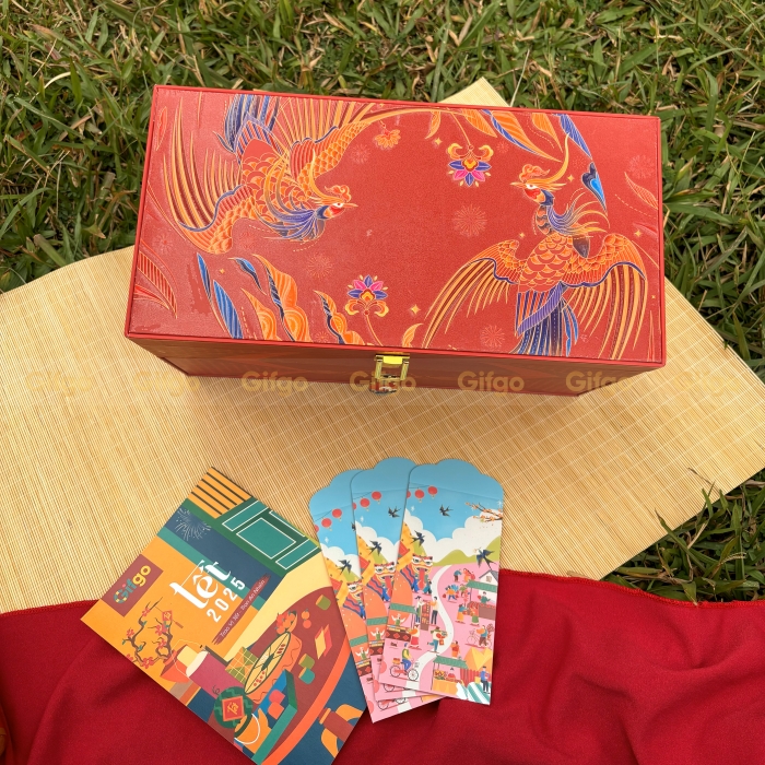 Sở hữu vẻ đẹp tinh tế và sang trọng, Set Quà Tết Tây Bắc gây ấn tượng với hình ảnh đôi chim phượng uyển chuyển kết thành vòng tròn vĩnh cửu, tỏa sáng rực rỡ trên nền sắc đỏ quý phái. Thiết kế này không chỉ biểu trưng cho tinh thần vượt khó mạnh mẽ mà còn mang ý nghĩa chào đón một khởi đầu tươi sáng, đầy hy vọng. Hộp quà được thiết kế 2 tầng hiện đại với không gian rộng rãi, mang đến sự linh hoạt và tiện lợi trong việc sắp xếp sản phẩm, tạo nên món quà hoàn hảo cho dịp Tết.