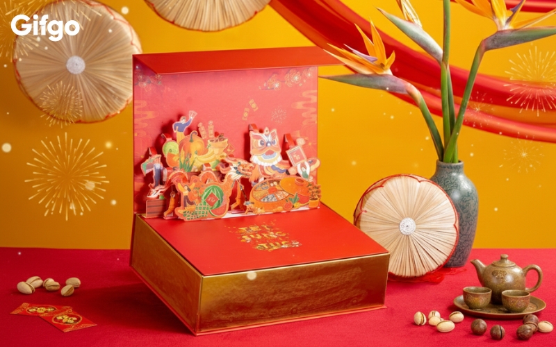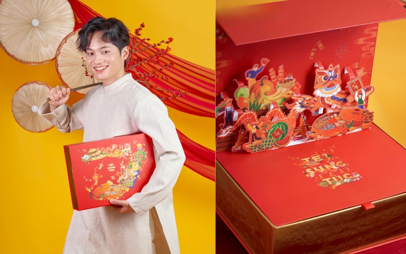Điểm nhấn đặc biệt nằm ở quy cách hộp nam châm nắp lật kết hợp cấu trúc 3D độc đáo, tái hiện sinh động khung cảnh ngày Tết cổ truyền: mâm cỗ sum vầy, lân sư rộn ràng, phố xuân tấp nập. Khi mở hộp, từng lớp không gian hiện ra như một bức tranh Tết sống động, gợi cảm giác đủ đầy, sung túc và gắn kết, đúng với tinh thần mà The Coach English mong muốn gửi trao đến đội ngũ, đối tác và cộng đồng.